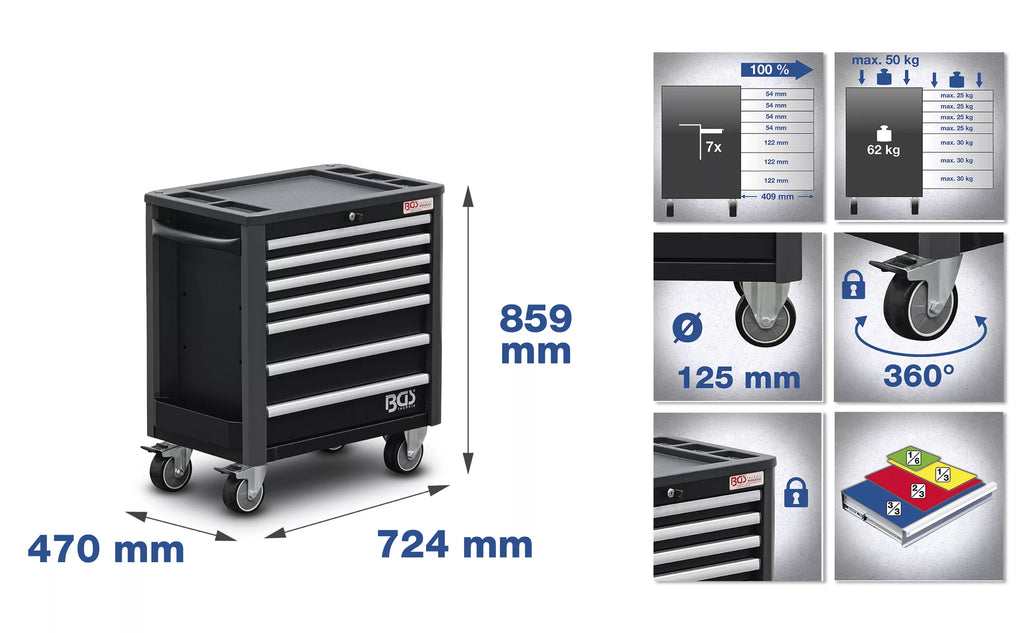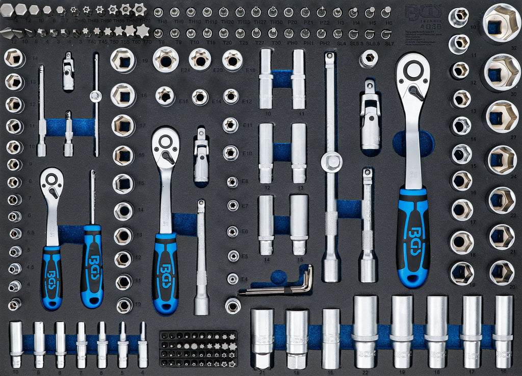 Vognen består av verkstedsvognen BGS 4102, inkludert 3 verktøybrett i høykvalitets, slitesterkt hardskum som sikrer lang levetid og beskyttelse av verktøyene.