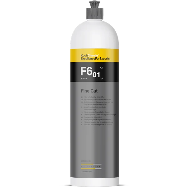 Fine Cut F6.01 er designet som et enstegsprodukt for å fjerne lette til mellomdype riper i myke og medium harde lakktyper. Produktet effektiverer riper tilsvarende P2500 slipepapir, og et finsteg er ikke nødvendig etter bruk. Ved svært slitt lakk, anbefales det å bruke H9.01 Heavy Cut for grovsteg og M3.02 for finsteg.