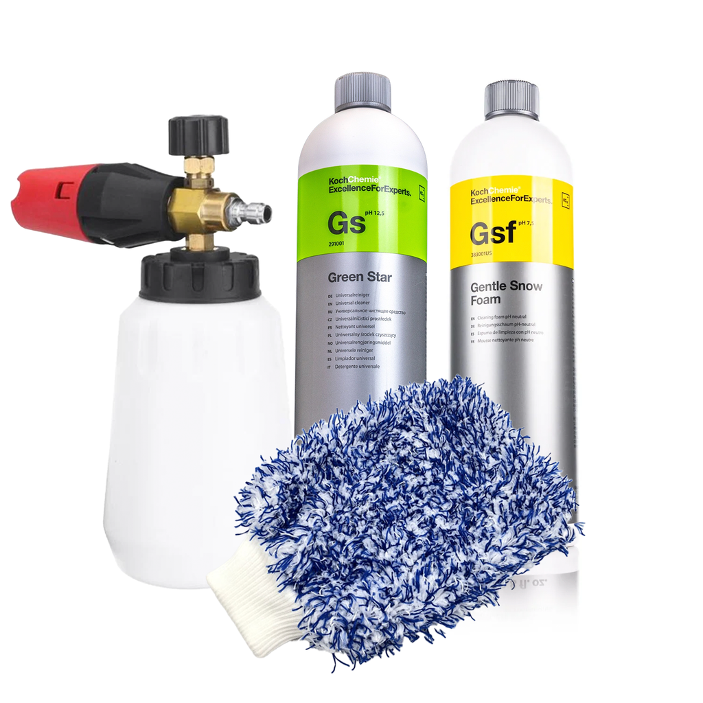 Alt du trenger for en rask, effektiv og skånsom vask av bilen – samlet i én pakke. Med Koch-Chemie Green Star, Gentle Snow Foam, Glossmeister skumkanon og mikrofiberhanske får du profesjonelt resultat uten kompliserte steg. Perfekt for deg som vil holde bilen ren og blank hele året.