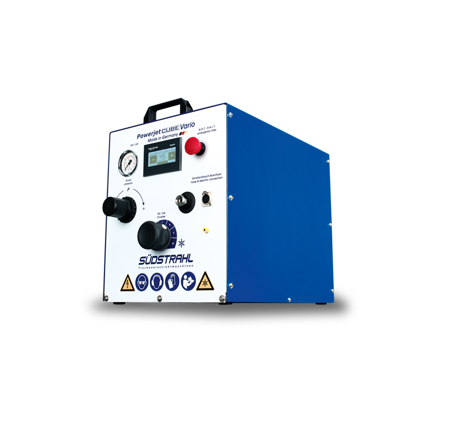 CUBE Vario. En profesjonell tørrisblåser i den velkjente, kompakte CUBE-størrelsen. Styres via en 3,4" berøringsskjerm. Justerbar mekanisk tørriskvern. For finarbeid fra 0,1 mm tørrisstørrelse til grovarbeid med 3,0 mm tørrisstørrelse og opptil 40 kg/t isforbruk.
